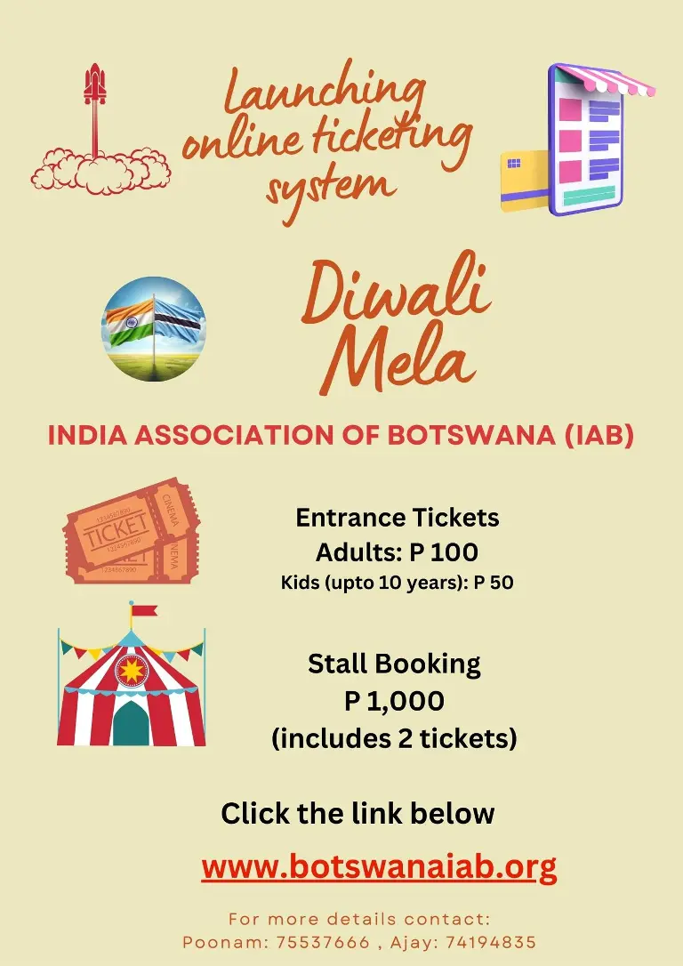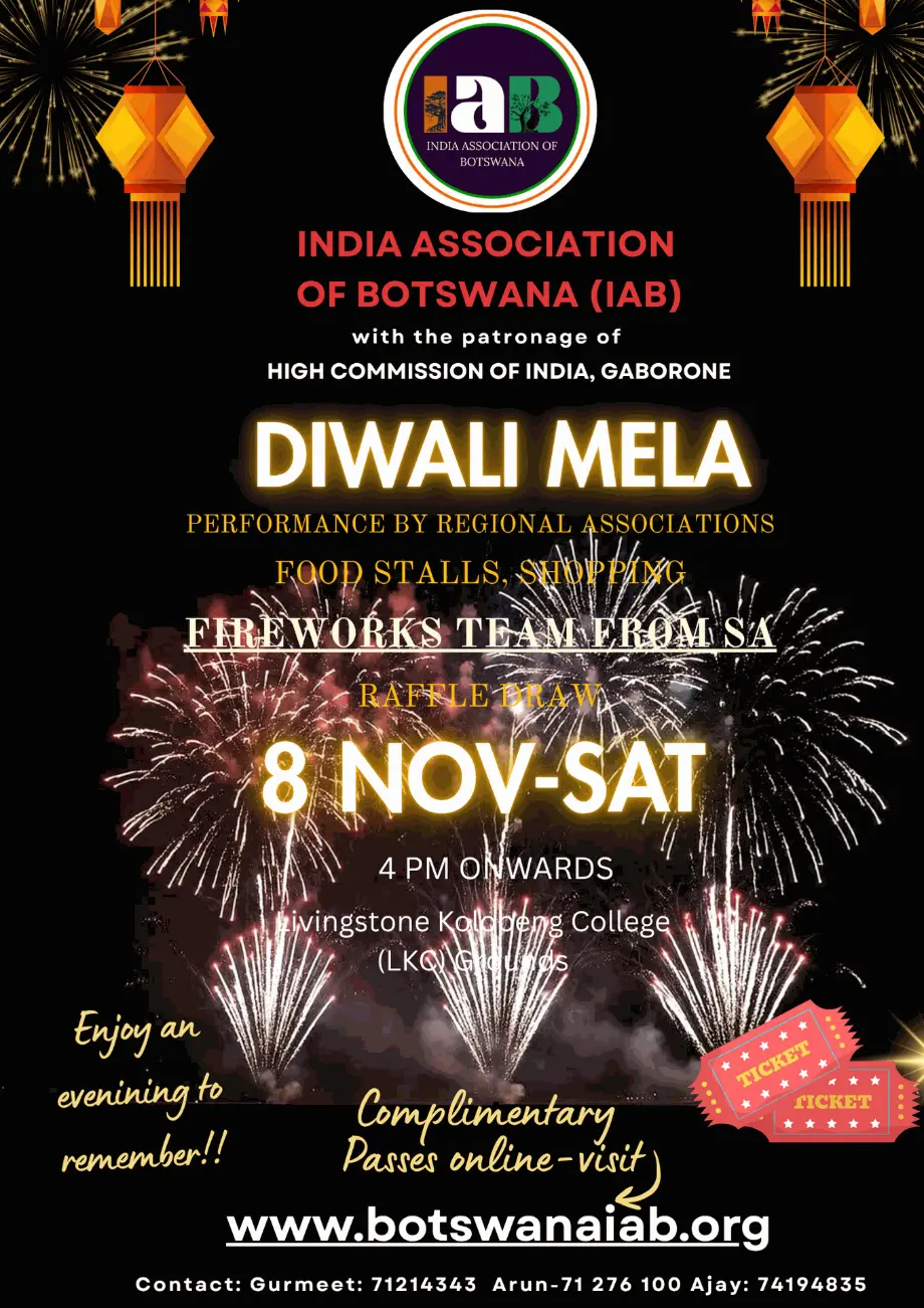 Join the India Association of Botswana (IAB) for an explosive Diwali celebration on Saturday, 8 November, starting 4 PM at Livingston Kolobeng College (LKC) Grounds! Dive into vibrant performances by regional associations, savor mouthwatering food stalls and shopping delights, catch fireworks blasting from the SA team, and win big in our raffle draw. Tickets just P80 (kids under 10 free)—book stalls for P500 online at www.botswanaiab.org. Light up with joy, laughter, and festive cheer! Contact: Gurmeet (71214343), Arun (71 276 100), Ajay (74194835). Don't miss the sparkle—see you there! 🎆🪔✨